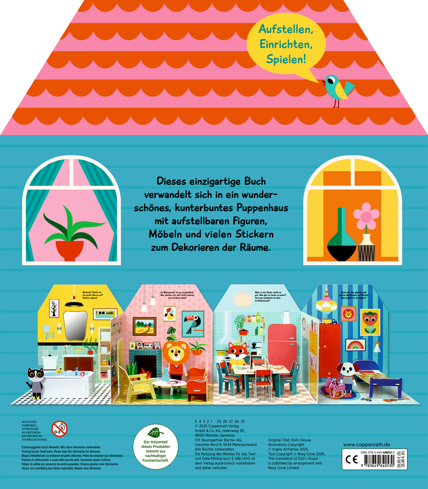 Dieses besondere Pappbilderbuch für Kinder ab 3 Jahren verwandelt sich im Handumdrehen in ein farbenfrohes Puppenhaus. Mit den aufstellbaren Figuren, Möbeln und Stickern zum Dekorieren können Kinder ihre eigenen kleinen Spielwelten gestalten. Die praktische Aufbewahrungsschublade, die im Buch integriert ist, sorgt dafür, dass alle Teile sicher verstaut bleiben – ideal für fantasievolle Spielstunden, ob zu Hause oder unterwegs.