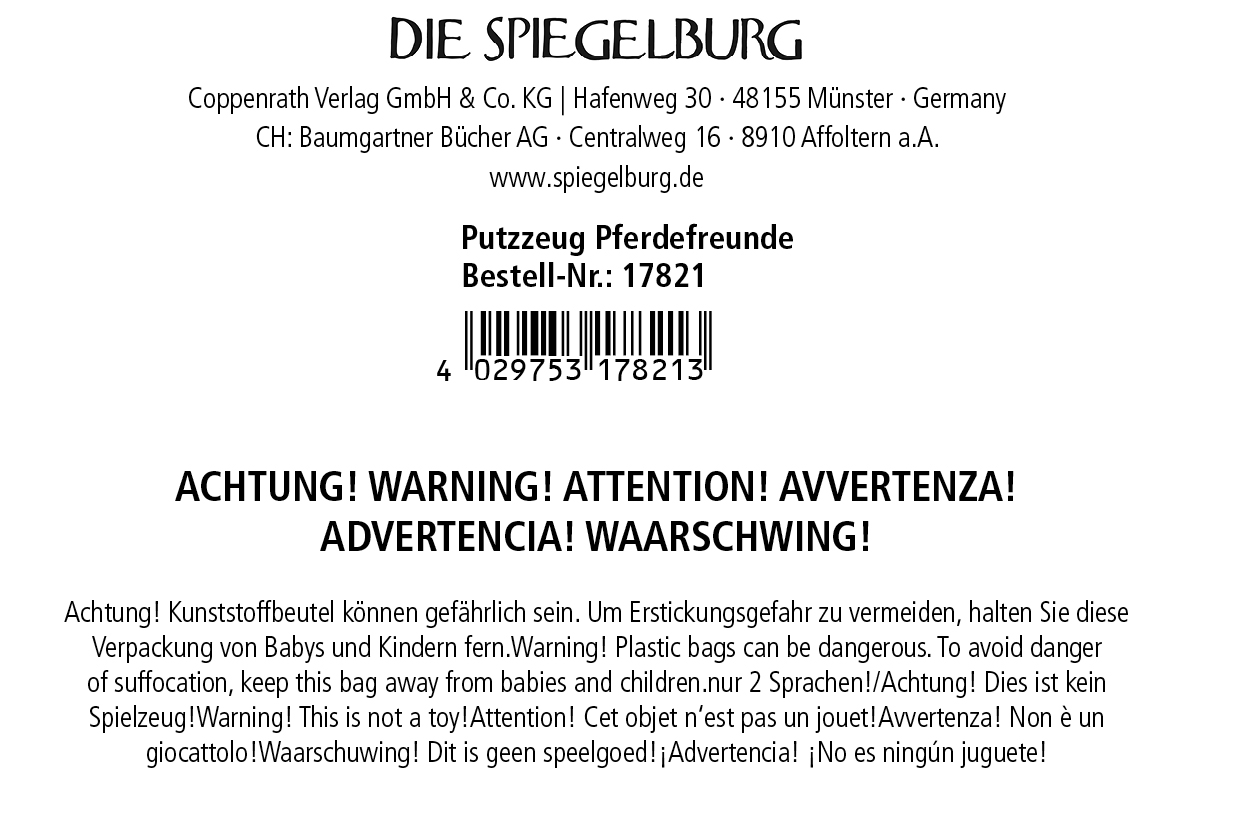 - Maße/ Gewicht/ Inhalt: Mähnenkamm: ca. 10 x 5 cm / Striegel: ca. 7 x 13,5 x 8 cm / Kardätsche: ca. 8 x 12,5 x 7 cm / Hufkratzer: ca. 14 cm Länge / Schwamm: ca. 17 x 11,5 x 4 cm / Putzbox: ca. 20 x 13 x 13 cm