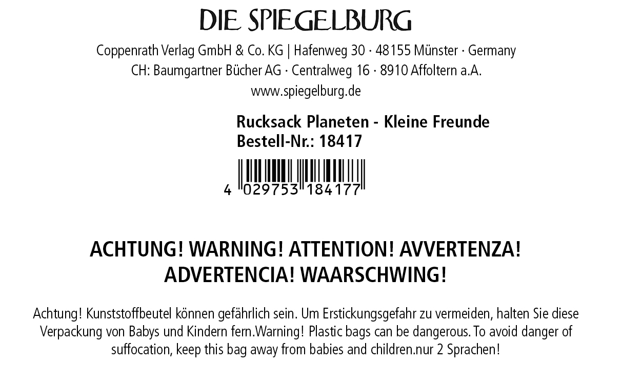 - Warnhinweis: Achtung! Kunststoffbeutel können gefährlich sein. Um Erstickungsgefahr zu vermeiden, halten Sie diese Verpackung von Babys und Kindern fern.