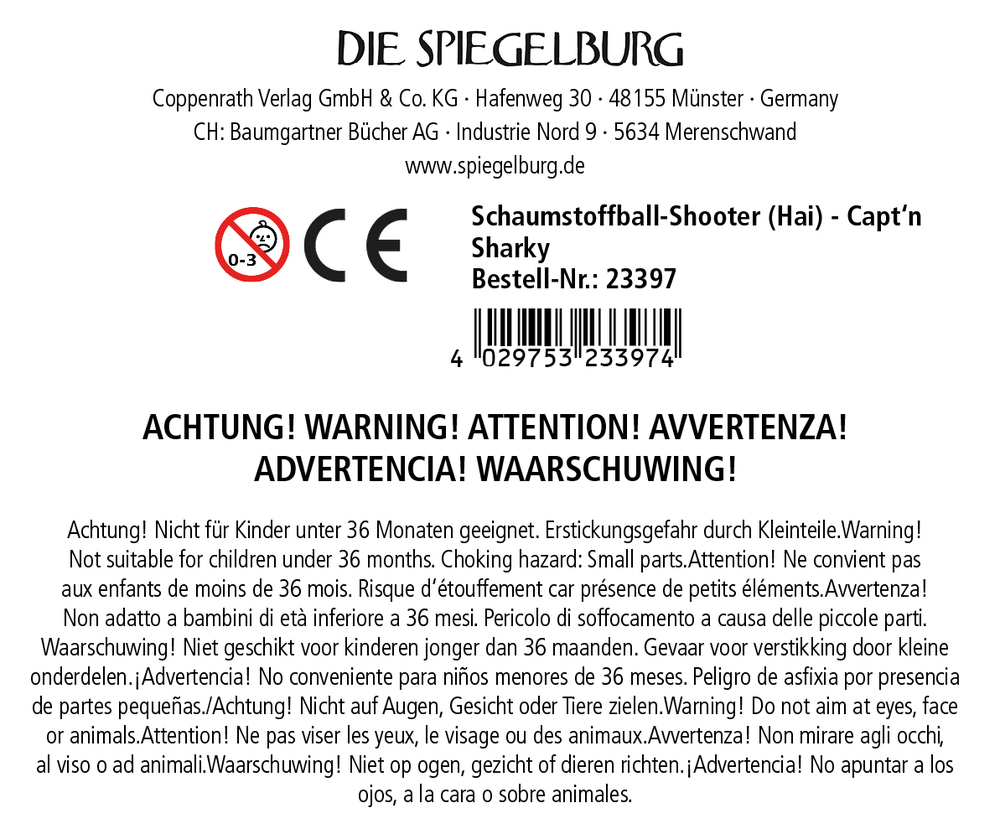 Der Schaumstoffball-Shooter Capt’n Sharky von Die Spiegelburg bringt Action und Spaß ins Spiel. Einfach pumpen und zielen – schon saust ein weicher Schaumstoffball durch die Luft. Im Set sind 6 Bälle enthalten, die nacheinander abgeschossen werden können. Mit seinem witzigen Hai-Design sorgt der Shooter für piratenstarken Spielspaß drinnen und draußen. Dank einer Größe von ca. 27 cm ist er handlich, schnell einsatzbereit und macht jede Piratencrew glücklich.
