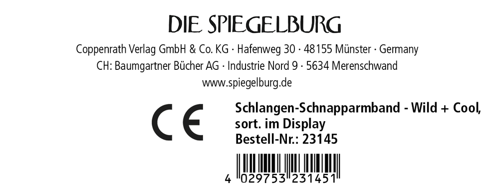Das Schlangen-Schnapparmband - Wild + Cool von Die Spiegelburg ist genau das Richtige für mutige Kids, die wilde Tiere lieben! Einfach mit einem Schwung ums Handgelenk schnappen lassen – schon windet sich die realistisch bedruckte Schlange blitzschnell um den Arm, fast wie eine echte. Ob als cooles Accessoire, zum Erschrecken von Freunden oder für abenteuerliche Rollenspiele – dieses Schnapparmband sorgt für Action. Mit einer Länge von ca. 30 cm ist es ein cooler Hingucker. In 4 Farben erhältlich.