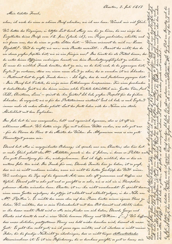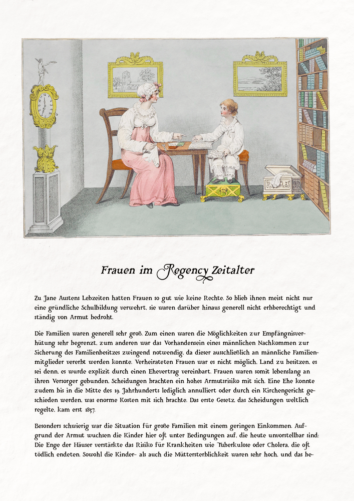 Jane Austen (*16. Dezember 1775 in Steventon, Hampshire; †18. Juli 1817 in Winchester) war eine englische Schriftstellerin, die für ihre scharfsinnigen Gesellschaftsromane bekannt ist. Sie wuchs in einer gebildeten Familie auf und begann früh mit dem Schreiben. Ihre bekanntesten Werke – Stolz und Vorurteil (1813), Emma (1815) und Sinn und Sinnlichkeit (1811) – zeichnen sich durch ihren feinen Humor, präzise Charakterdarstellungen und soziale Kritik aus. Trotz ihres literarischen Erfolgs veröffentlichte sie ihre Romane anonym. Austen starb im Alter von 41 Jahren vermutlich an Morbus Addison und hinterließ ein bedeutendes literarisches Erbe, das sie zu einer der bekanntesten Autorinnen der englischen Literatur machte.