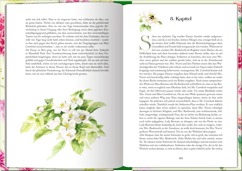Cover und Gestaltung: Ich bin so en großer Fan dieses wunderschönen Covers! Die Blumen sind meine absoluten Lieblinge und die Prägung fühlt sich einfach so gut an! Diesmal gab es noch eine Banderole die vorsichtig um alle Seiten gebunden ist, was das Buch einfach noch Edler aussehen lässt. Außerdem gibt es wieder ein Lesebändchen und tolle Beigaben die einem während des Lesens begleiten. Meine Meinung: Jane Austen gehört mittlerweile zu meinen liebsten Autorinnen und ich war umso gespannter auf diese Geschichte da ich sie noch nicht kannte. Fanny ist ehr eine sehr ruhige Protagonisten die aber trotzdem sehr intelligent ist für ihre Zeit. Sie macht was ihr gefällt und lässt sich von keinen Mann unterbuttern. Ich habe sie beim lesen sehr in mein Herz geschlossen und konnte viele ihrer Entscheidungen sehr nachvollziehen. Da sie nicht reich geboren ist, es später aber gut haben sollte, kam sie nach Mansfield Park. Dort entwickelt sie eine tiefe Freundschaft zu einem Jungen woraus später Liebe wird. Das Buch hat seine höhen und tiefen, oft sehr emotional. Mir ist die eine oder andere Träne geflossen da ich mich extrem in die Geschichte reingesteigert hatte. Jane Austen beweist auch hier wieder ihren romantischen Schreibstil der sehr fesselnd ist. Für mich ist die Geschichte sehr wichtig und ich finde jeder Romantikfanatiker sollte sie lesen. Außerdem haben mich beim lesen wieder die wunderschönen Illustrationen von der Künstlerin Marjolein Bastin sehr begeistert, auch die tollen beigaben waren wieder wundervoll in die Geschichte mit eingeflochten. Das Buch ist so schön man liest wirklich mit Vorsicht und bedacht. Ich bin sehr begeistert! Fazit: Für mich ein großartiger Klassiker den man unbedingt mal gelesen haben sollte, vor allem wenn einem romantische Geschichten gefallen.