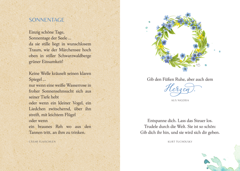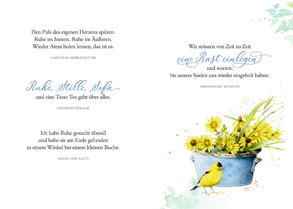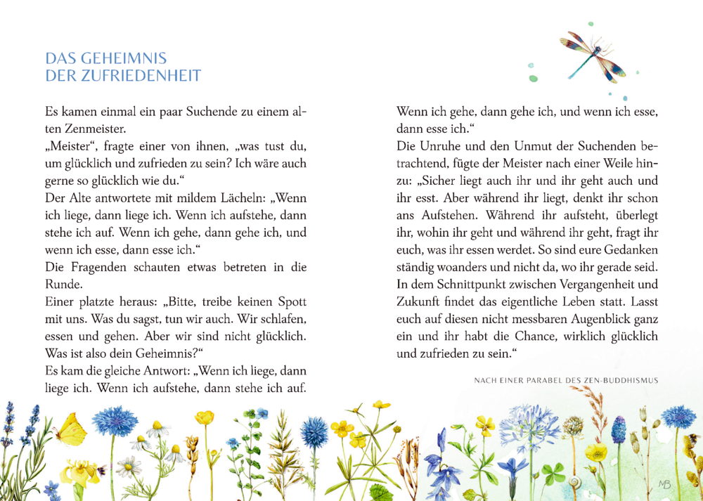 Genieße die kleinen Dinge des Lebens! Einfach mal abschalten, sich ein wenig Ruhe gönnen und sich eine Auszeit vom Alltag nehmen – wer wünscht sich das nicht? Mit stimmungsvollen Gedichten, schönen Geschichten und kleinen Tipps hilft dieses bibliophile Buch, sich selber eine kleine Oase der Achtsamkeit zu schaffen. Unterstützt werden Sie dabei von den wundervollen Illustrationen der bekannten Künstlerin Marjolein Bastin, die das Buch zu einem Hingucker machen. Das perfekte Geschenk zu vielen Gelegenheiten an die Menschen, denen wir das Glück in der Ruhe wünschen.