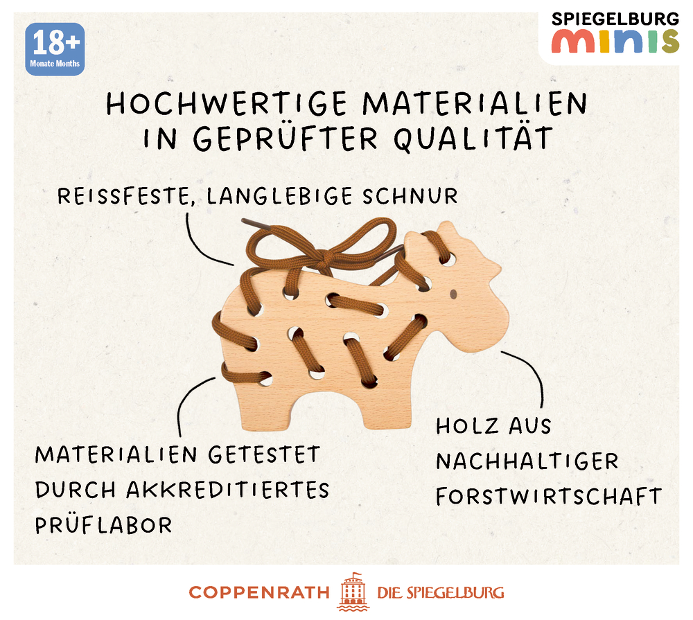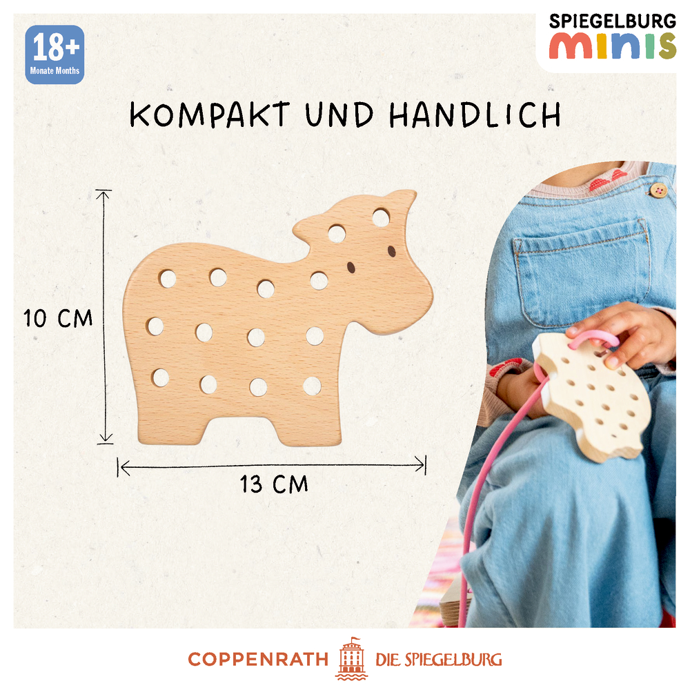 Das Fädelspiel - Spiegelburg minis von Die Spiegelburg macht Kindern Spaß und stärkt nebenbei ihre Feinmotorik. Mit der bunten Fädelschnur kann das Holzschwein immer wieder neu durchzogen werden. So entsteht ein kleines Kunstwerk, das Geschick, Konzentration und Geduld fördert, ohne dass es sich nach Lernen anfühlt.