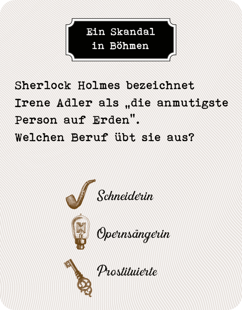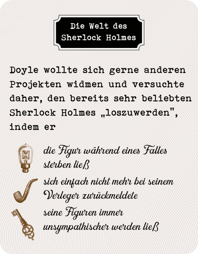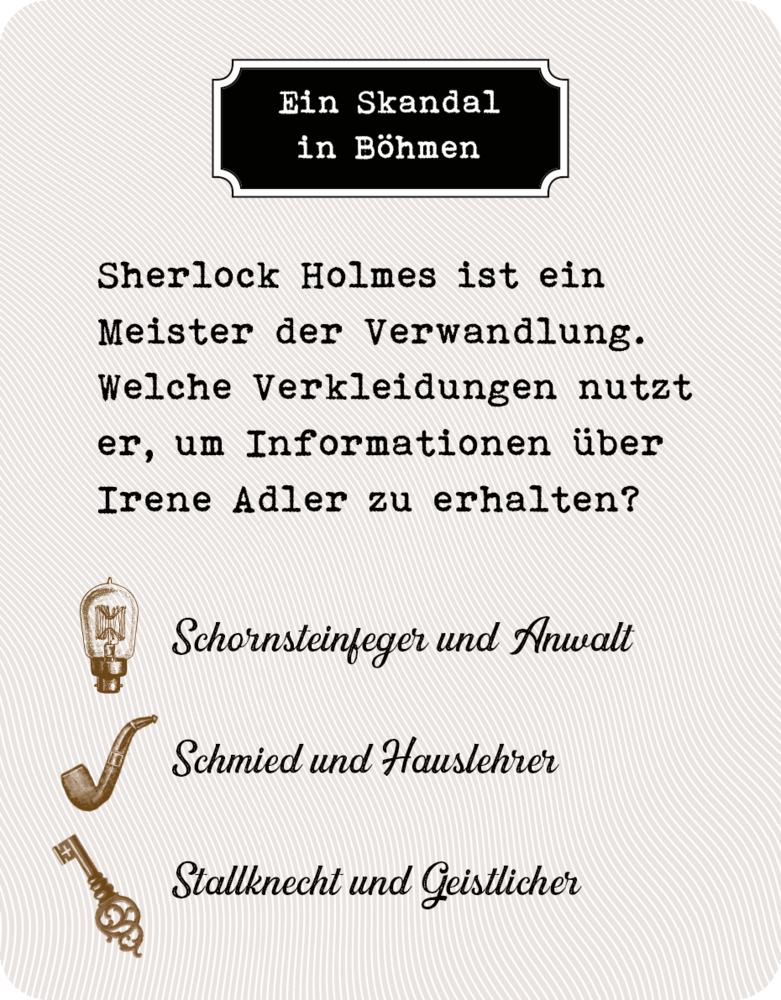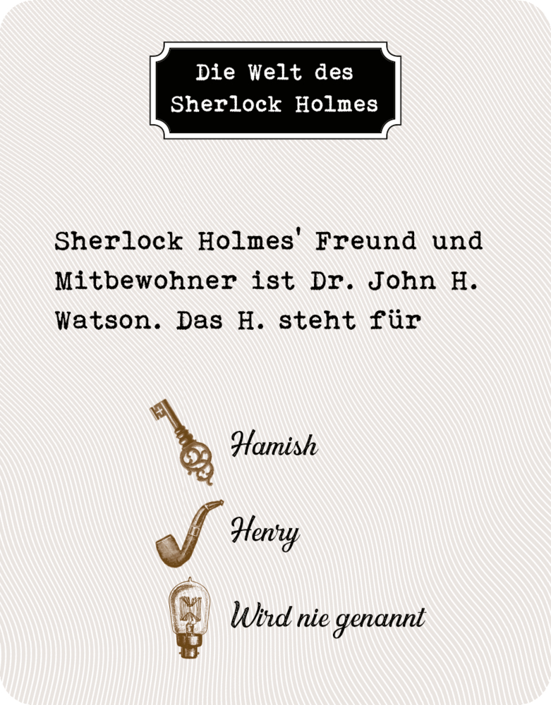 Der berühmteste Detektiv der Weltliteratur und seine Geschichten stecken voller Rätsel. Amüsante Fragen rund um das Universum von Sherlock Holmes und seinen Schöpfer Arthur Conan Doyle sowie spannende Funfacts machen dieses Quiz zu einem perfekten Geschenk für alle Sherlock Holmes Fans.