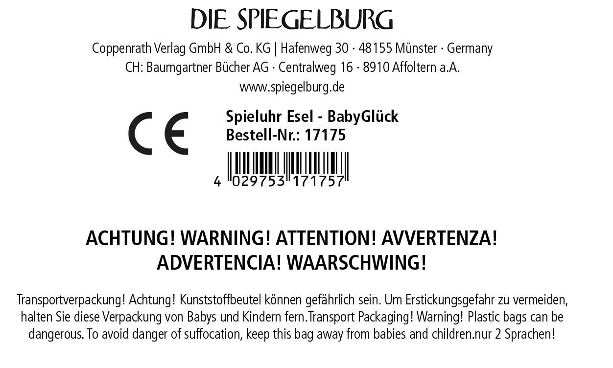 - Warnhinweis: Transportverpackung! Achtung! Kunststoffbeutel können gefährlich sein. Um Erstickungsgefahr zu vermeiden, halten Sie diese Verpackung von Babys und Kindern fern.