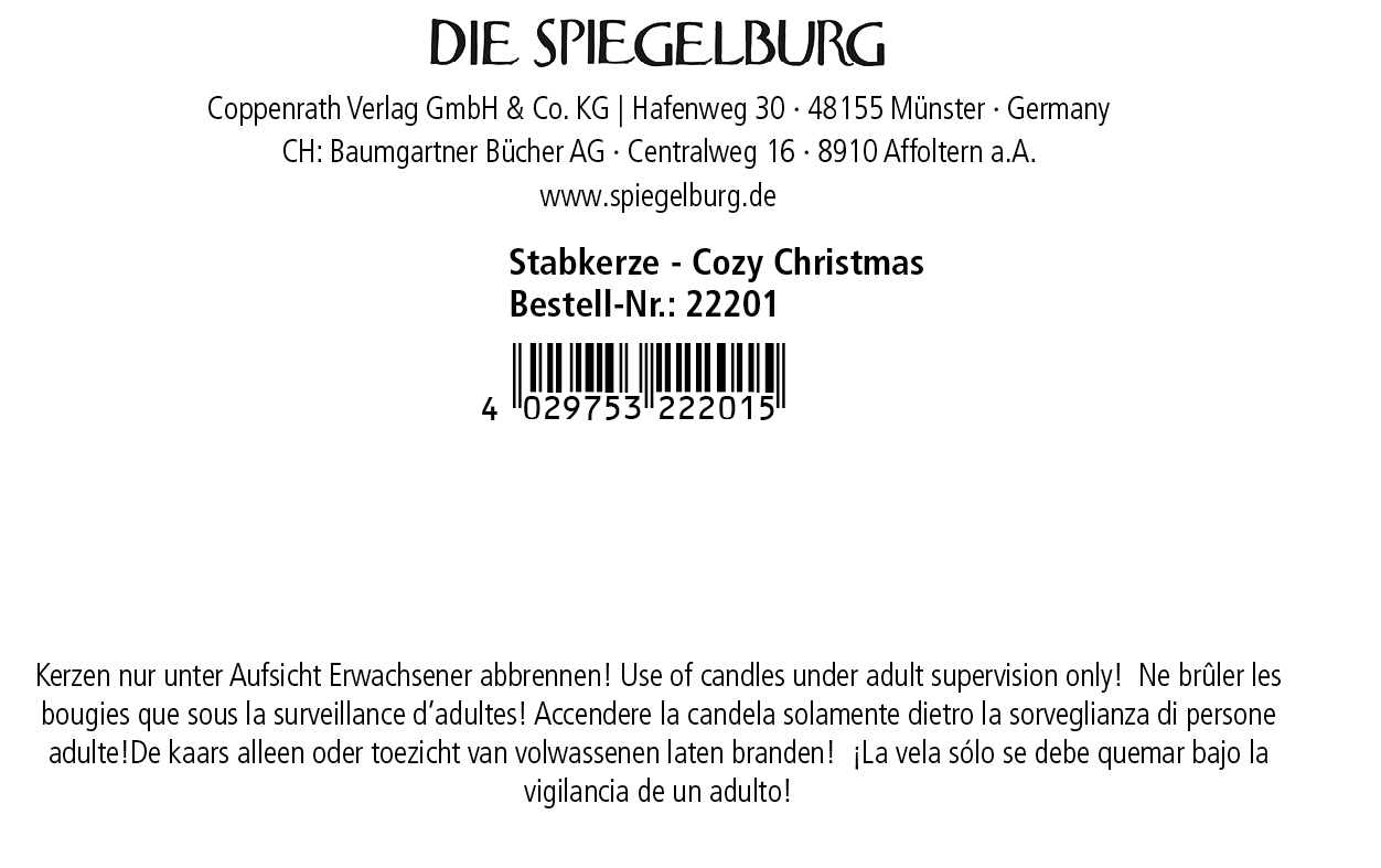 - Warnhinweis: gelbes Warndreieck + Piktogramme (alle Zielgruppen); Kerzen nur unter Aufsicht Erwachsener abbrennen! (Zielgruppe Kinder)