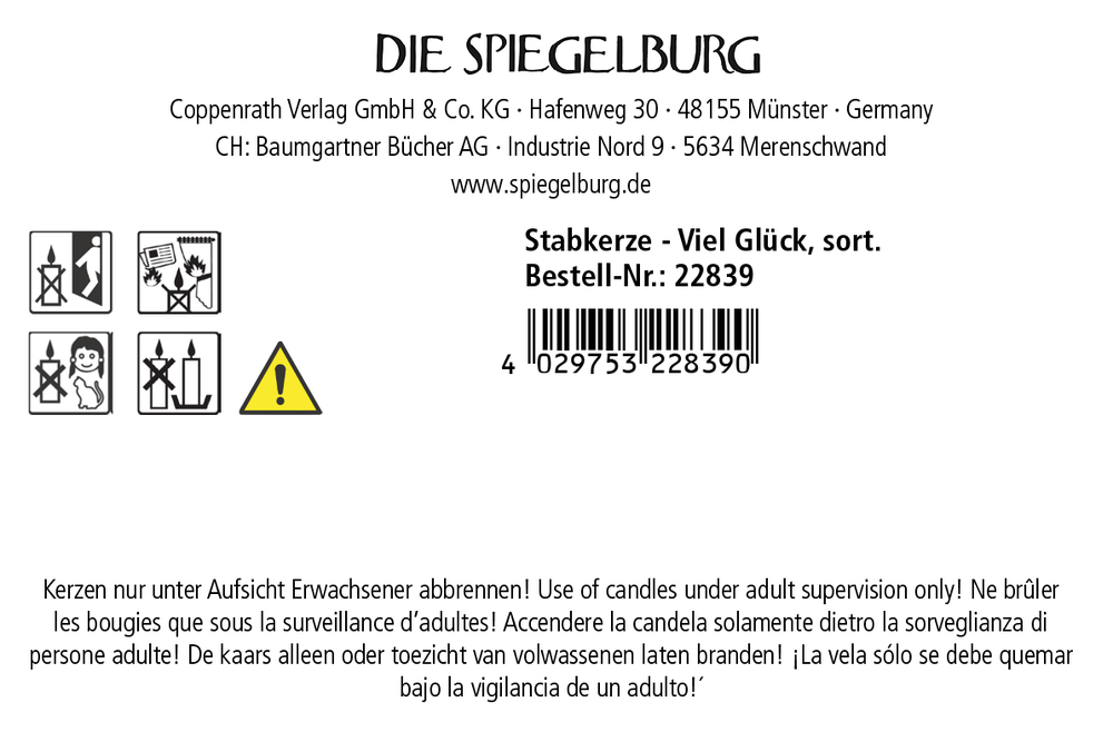 - Warnhinweis: gelbes Warndreieck + Piktogramme (alle Zielgruppen); Kerzen nur unter Aufsicht Erwachsener abbrennen! (Zielgruppe Kinder)