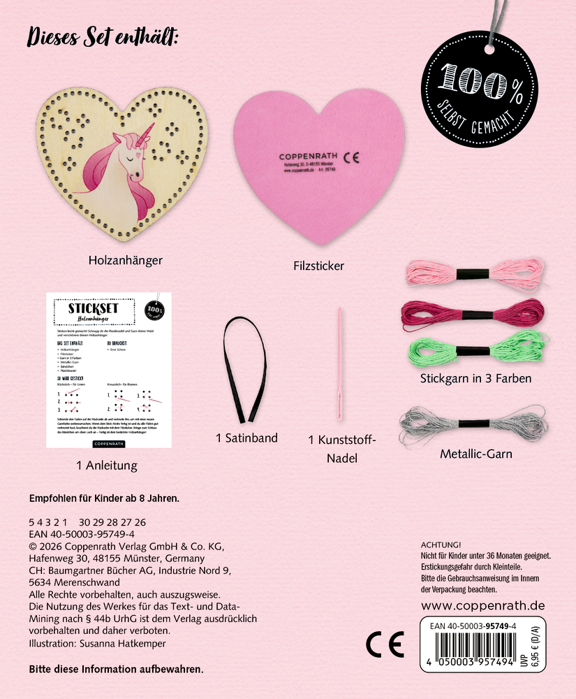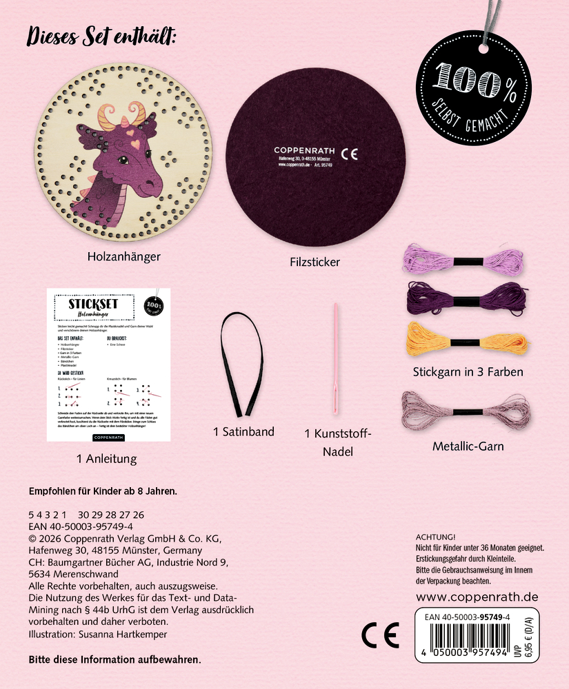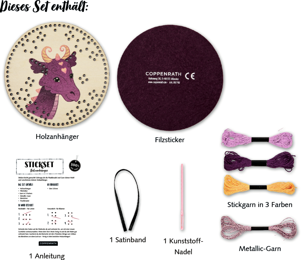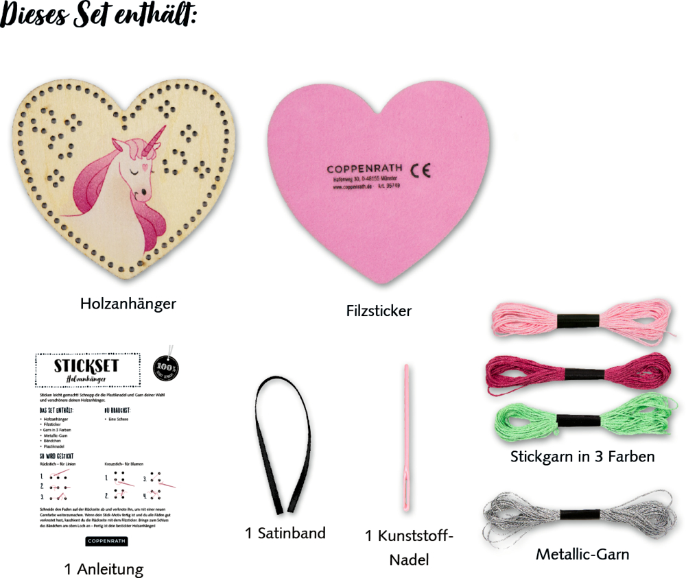 - Beigaben: in bedruckter Kartonverpackung (13 x 16 x 1,5 cm) mit Holzanhänger, Nähgarn, Metallicgarn, 1 Kunststoff-Nadel, 1 Satinband und Anleitung