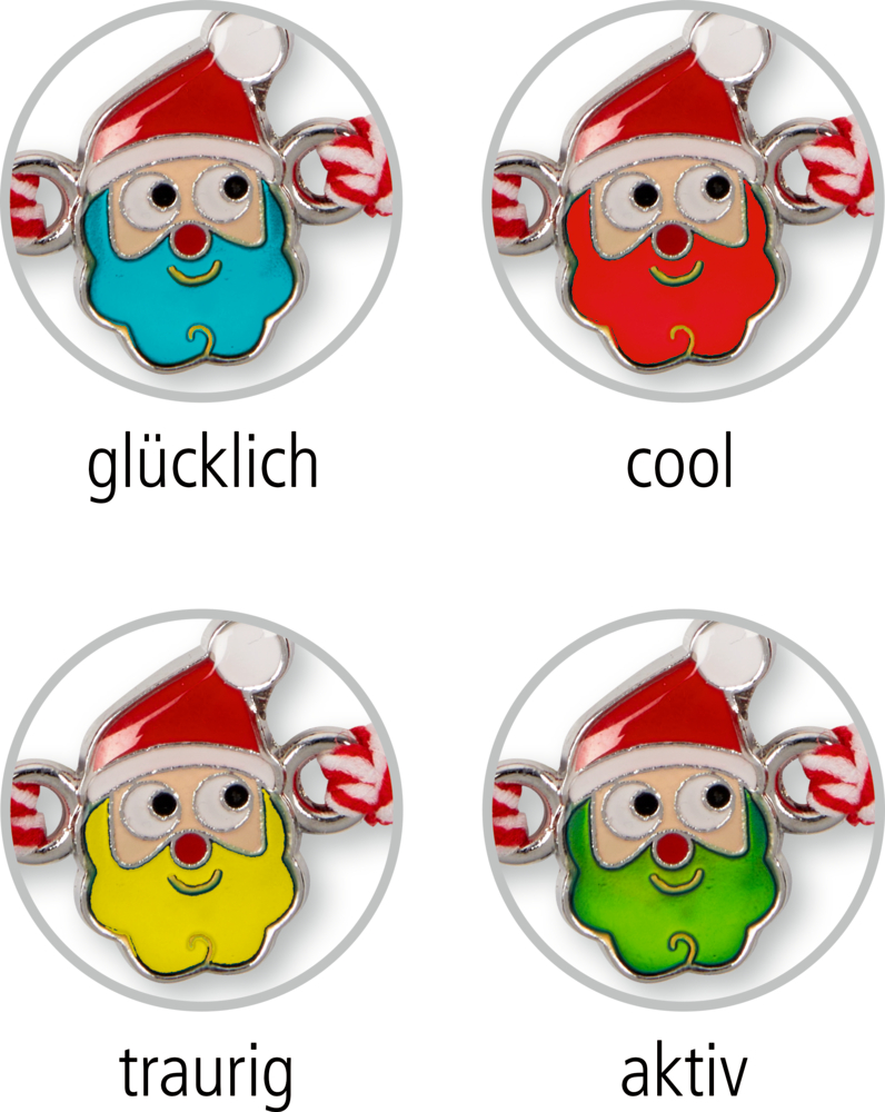 Glücklich, traurig, cool oder aktiv? Das weihnachtliche Stimmungsarmband weiß es genau. Die Farbe des kleinen Anhängers wechselt, je nach Stimmung des Trägers, seine Farbe. Pure Magie! Das Bändchen des Armbands besteht aus robustem Polyamid, das selbst wildesten Abenteuern standhält. Es lässt sich kinderleicht an jedes Handgelenk anpassen, da es in der Größe verstellbar ist. So passt das Armband perfekt und kann mitwachsen. Eine himmlische Kleinigkeit für den Adventskalender oder Nikolausstiefel. Das Armband ist in 3 Designs erhältlich.