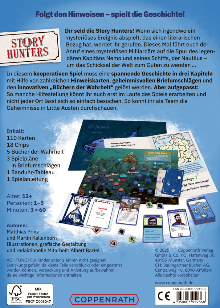 In einem kooperativen Spiel muss eine spannende Geschichte mit Hilfe von zahlreichen Hinweiskarten, geheimnisvollen Briefumschlägen und den innovativen „Büchern der Wahrheit" gelöst werden. Aber aufgepasst: So manche Hilfestellung könnt ihr euch erst im Laufe des Spiels erarbeiten und nicht jeder Ort lässt sich so einfach besuchen.