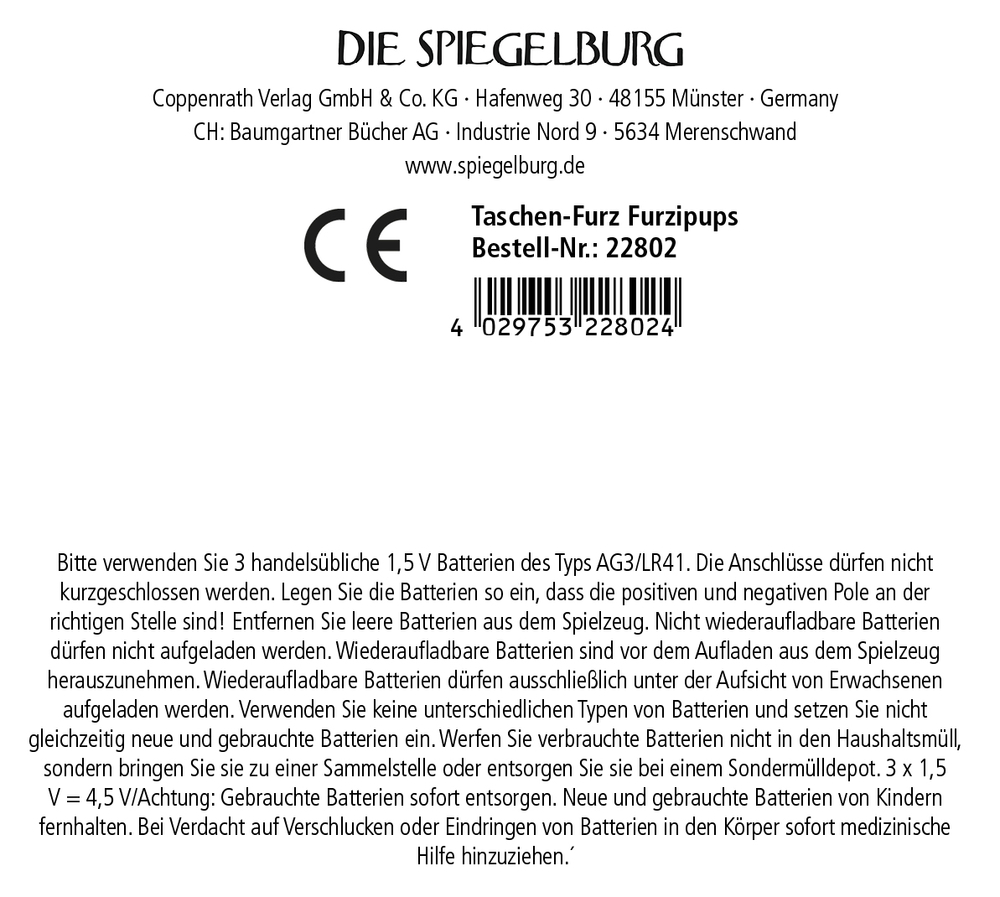 Kleiner Button, großer Spaß! Der Taschen-Furz Furzipups von Die Spiegelburg sorgt mit 6 unterschiedlichen Furz-Geräuschen für jede Menge Lacher. Egal, ob zu Hause oder unterwegs: Auf Knopfdruck erklingt ein lustiges Geräusch. Mit einem Durchmesser von ca. 4,5 cm und einer Höhe von 2 cm passt der Soundbutton bequem in jede Hosentasche und ist dank der enthaltenen Batterien (3 x AG3/LR41) sofort einsatzbereit. Hergestellt aus robustem Kunststoff, ist der Taschen-Furz ein langlebiger Spaßgarant.