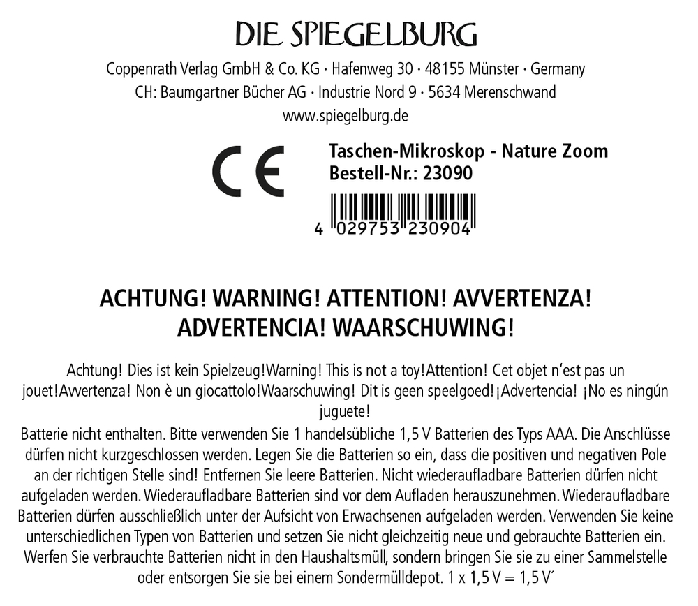 Mit dem Taschen-Mikroskop von Die Spiegelburg wird die Natur zum Forschungsfeld: Ob Blätter, Insekten oder kleine Fundstücke – mit 60- bis 120-facher Vergrößerung lassen sich selbst winzige Details ganz groß erleben. Dank Handschlaufe liegt es sicher in der Hand und ist mit einer Größe von ca. 10 x 3 x 4,5 cm kompakt genug, um bei jedem Ausflug dabei zu sein. Für den Betrieb wird eine AAA-Batterie benötigt (nicht enthalten).