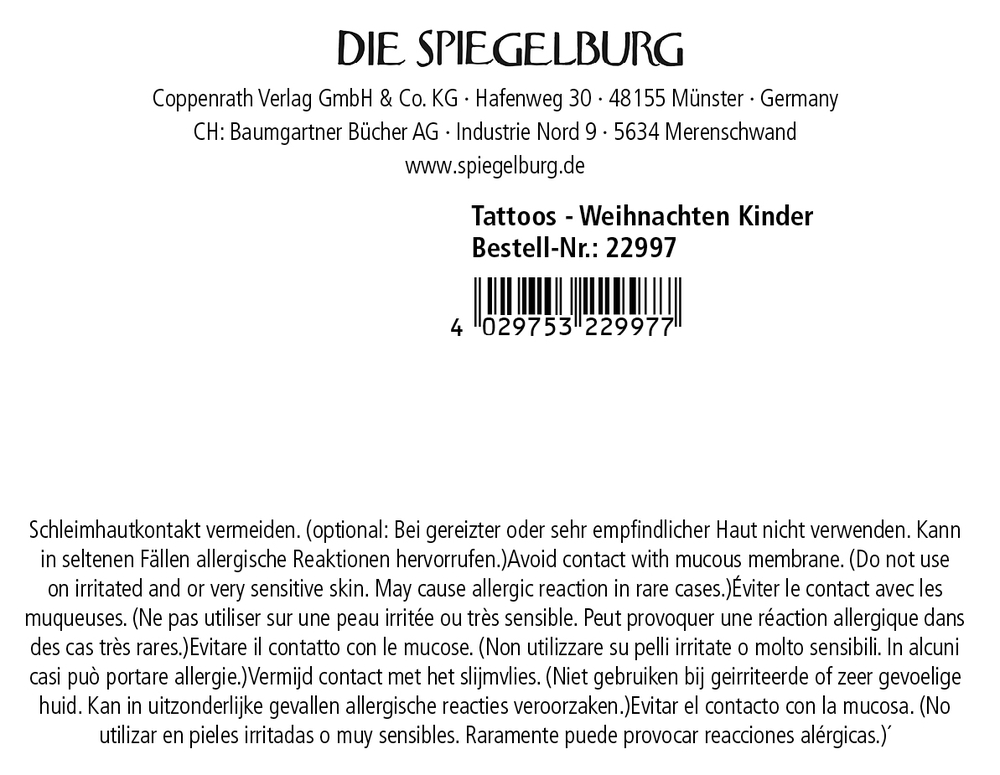 Die weihnachtlichen Tattoos von Die Spiegelburg bringen fröhliche Wintermotive direkt auf die Haut und sorgen für festlichen Spaß in der Adventszeit. Das Set enthält eine bunte Auswahl an Motiven, die sich leicht auftragen und mit Seife im Handumdrehen wieder entfernen lassen. Eine schöne Idee für den selbstgemachten Adventskalender und den Nikolausstiefel.