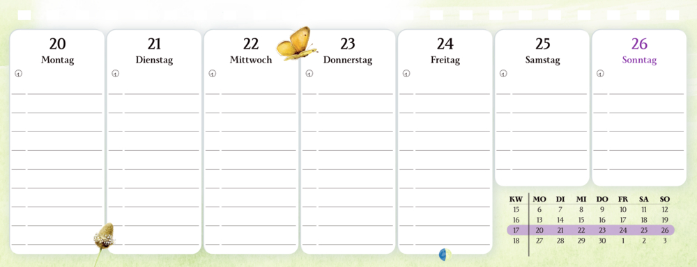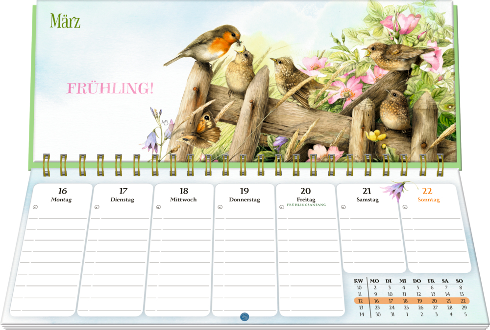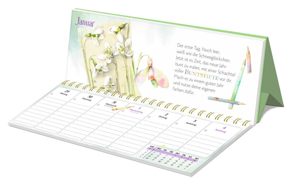 Mit 53 zauberhaften Naturmotiven und zu Herzen gehenden Texten der Künstlerin Marjolein Bastin lädt dieser persönliche Tischkalender jede Woche aufs Neue dazu ein, das Leben von der positiven Seite zu betrachten. Dank großer Eintragfelder zu frei wählbaren Uhrzeiten an jedem Tag finden alle Termine problemlos Platz. Die Monatsübersicht auf jeder Seite erleichtert das Planen im Büro oder zu Hause. Mithilfe des hochwertigen Aufstellers steht das Motiv auf dem Schreibtisch im Mittelpunkt und ermöglicht das mühelose Schreiben auf ebener Fläche – auch dank des hochwertigen FSC-zertifizierten Papiers. Ein bezauberndes und inspirierendes Accessoire für jeden Schreibtisch! Mit Jahresübersicht, Schulferienterminen, Feiertagen und Geburtstagsplaner.
