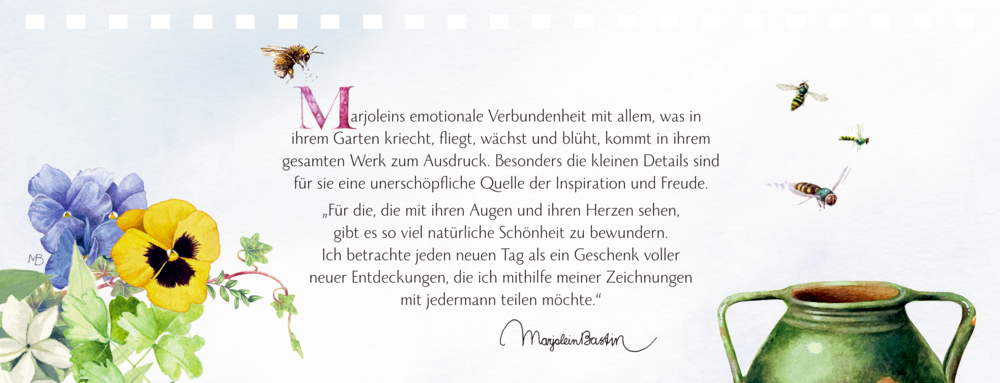 Marjolein Bastin entwickelte schon als Kind eine besondere Leidenschaft für die Natur. Nach dem Besuch der Akademie für Bildende Kunst in Arnheim arbeitete die Holländerin zunächst für verschiedene Werbeagenturen und Verlage, unter anderem für die Zeitschrift Libelle. Dort erscheint seit über 30 Jahren Woche für Woche ihre eigene Rubrik mit Naturmotiven. Seit den 90er Jahren zeichnet Marjolein neben mitteleuropäischen Pflanzen und Tieren auch Motive aus Nordamerika und der Karibik. Ihre Arbeiten begeistern Menschen auf der ganzen Welt und sind inzwischen auf Karten, Kalendern, Tischgeschirr, Bettbezügen, Geschenkartikeln und vielen anderen schönen Dingen zu finden.