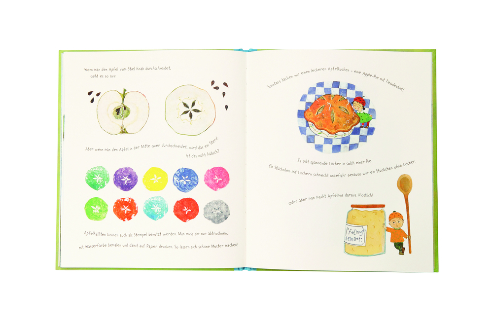 Ein super schön illustriertes Buch, das nicht zu trocken, Kindern zeigt, wie sich ein Baum im Laufe des Jahres verändert, wie und warum die Äpfel reifen und was man daraus machen kann. Mit Bastelideen und Kochrezept. Eignet sich schon für Kinder ab 3 Jahren und ist auch ein schönes Geschenk, direkt zusammen mit einem Apfelkorb!