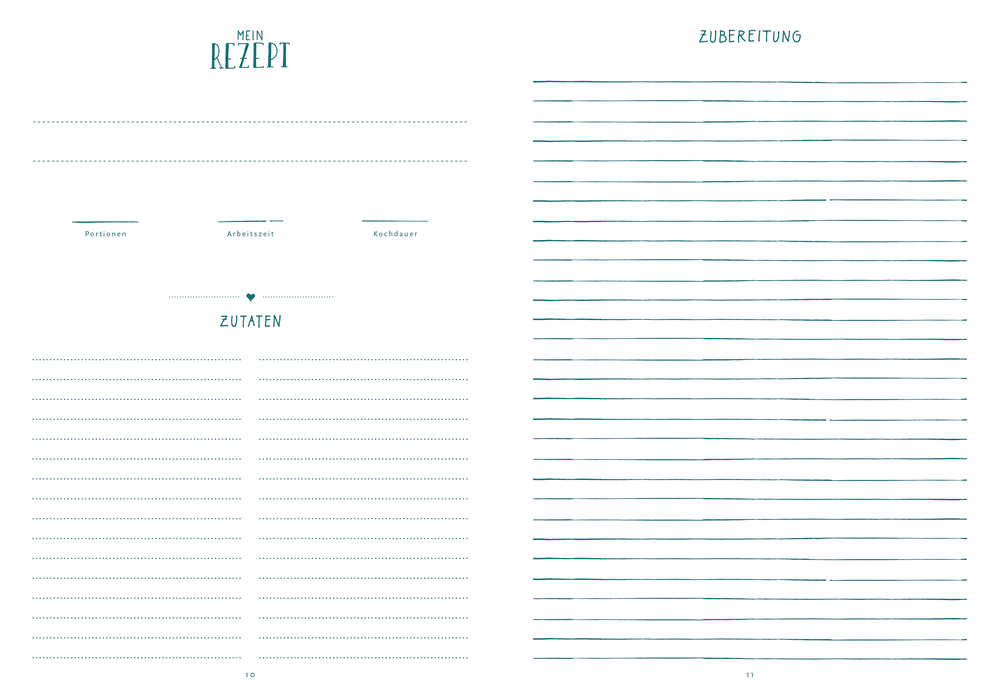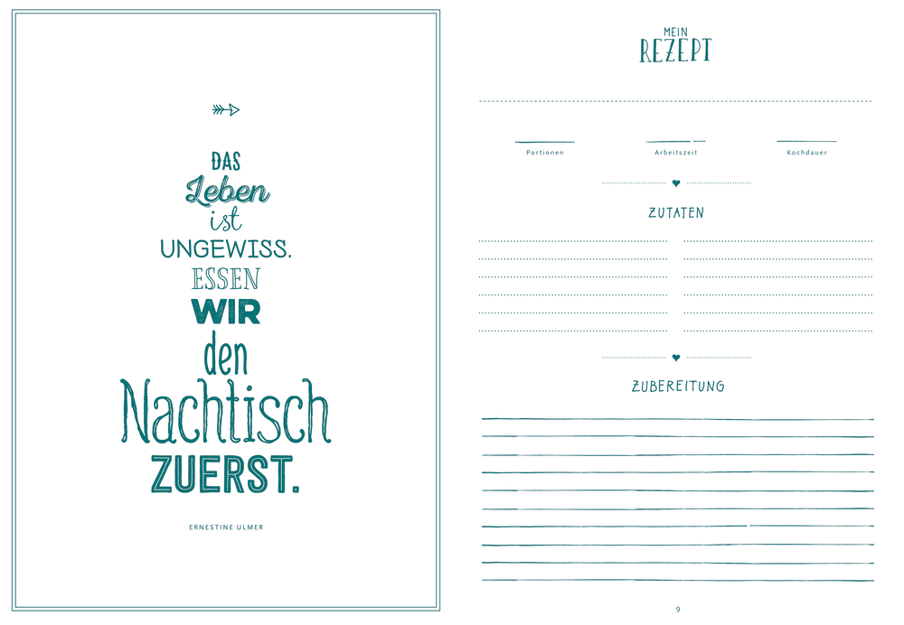Liebevoll gestaltetes DIY-Einschreibheft mit kulinarischen Zitaten und Goldfolienveredelung. Mit separater Zutatenliste und Inhaltsverzeichnis zum Selbstgestalten.