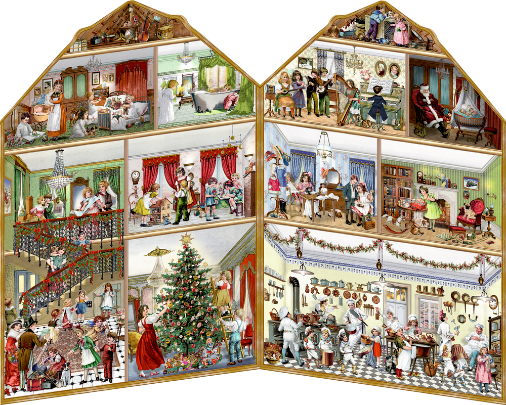 Dieses nostalgische Aufstellhaus bietet pure Weihnachtsstimmung. Mit 24 Verwandeltürchen auf der Innenseite entdecken Sie Tag für Tag unzählige Kleinigkeiten! Motiv: Historisches Verlagshaus Coppenrath. Mit Glitter und Goldfolie.