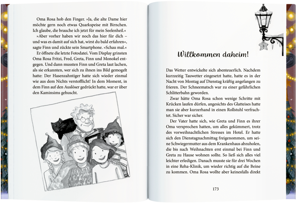 Als Oma Rosa auf dem Weihnachtsmarkt stürzt, kümmern sich Finn und Greta um ihren Buchladen – mit allerhand kreativen Ideen und mithilfe des schusseligen Mitarbeiters Monokel, den ein Geheimnis zu umgeben scheint.