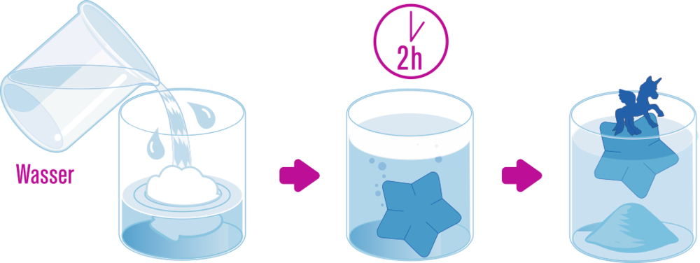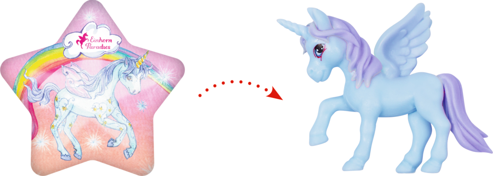 Ein tolles Überraschungsgeschenk für alle Einhorn-Fans: Legt man den Zauberstern ins Wasser, löst sich eine Sternen-Hälfte auf und gibt das Einhorn in rosa oder blau frei. Stern aus Kunststoff und Maisstärke. Einhorn aus Kunststoff.